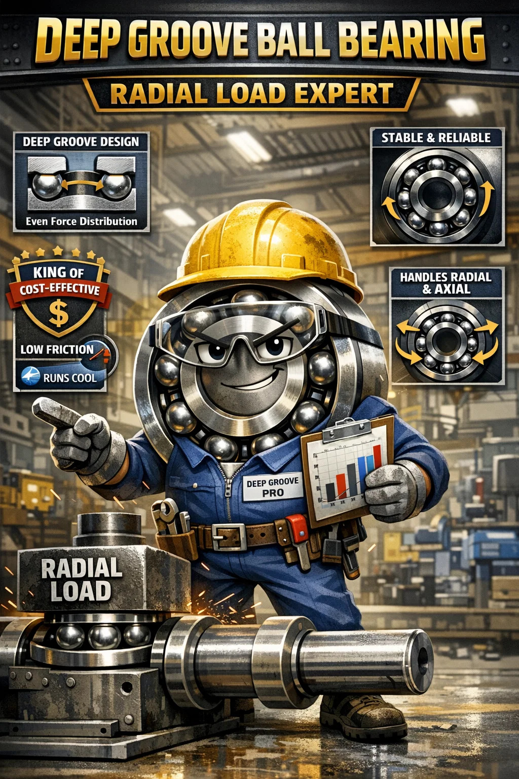 Kuglični ležajevi s dubokim žljebovima prvenstveno su dizajnirani i najprikladniji za rukovanje radijalnim opterećenjima (tj. silama okomitim na osovinu, poput sile teškog predmeta koji pritišće osovinu).